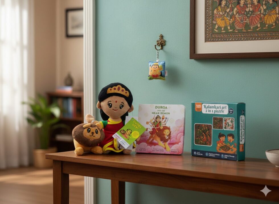 A Durga Devi inspired eco-friendly gift set featuring a 7-inch Mantra Singing Durga plush, an illustrated Durga storybook, a double-sided Kalamkari festival puzzle (Holi & Diwali), and a soft 2.5-inch Hanuman keychain. Designed to blend cultural learning with interactive, child-friendly play—perfect for gifting and everyday use.