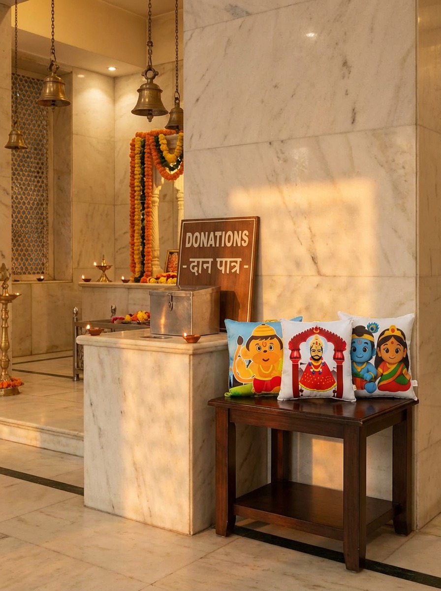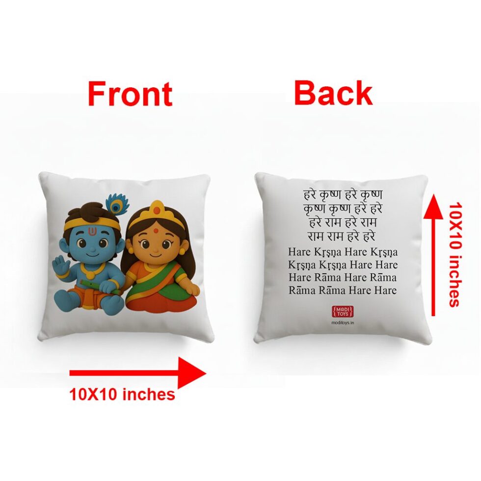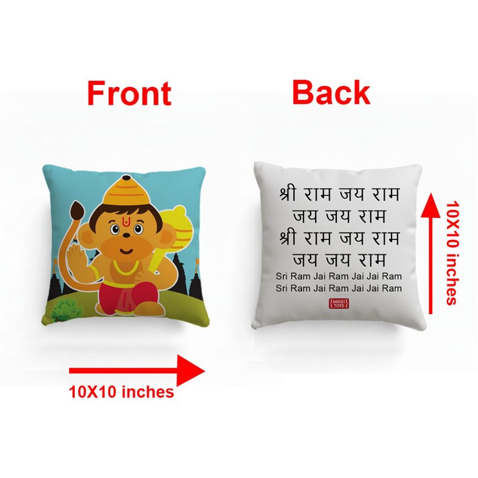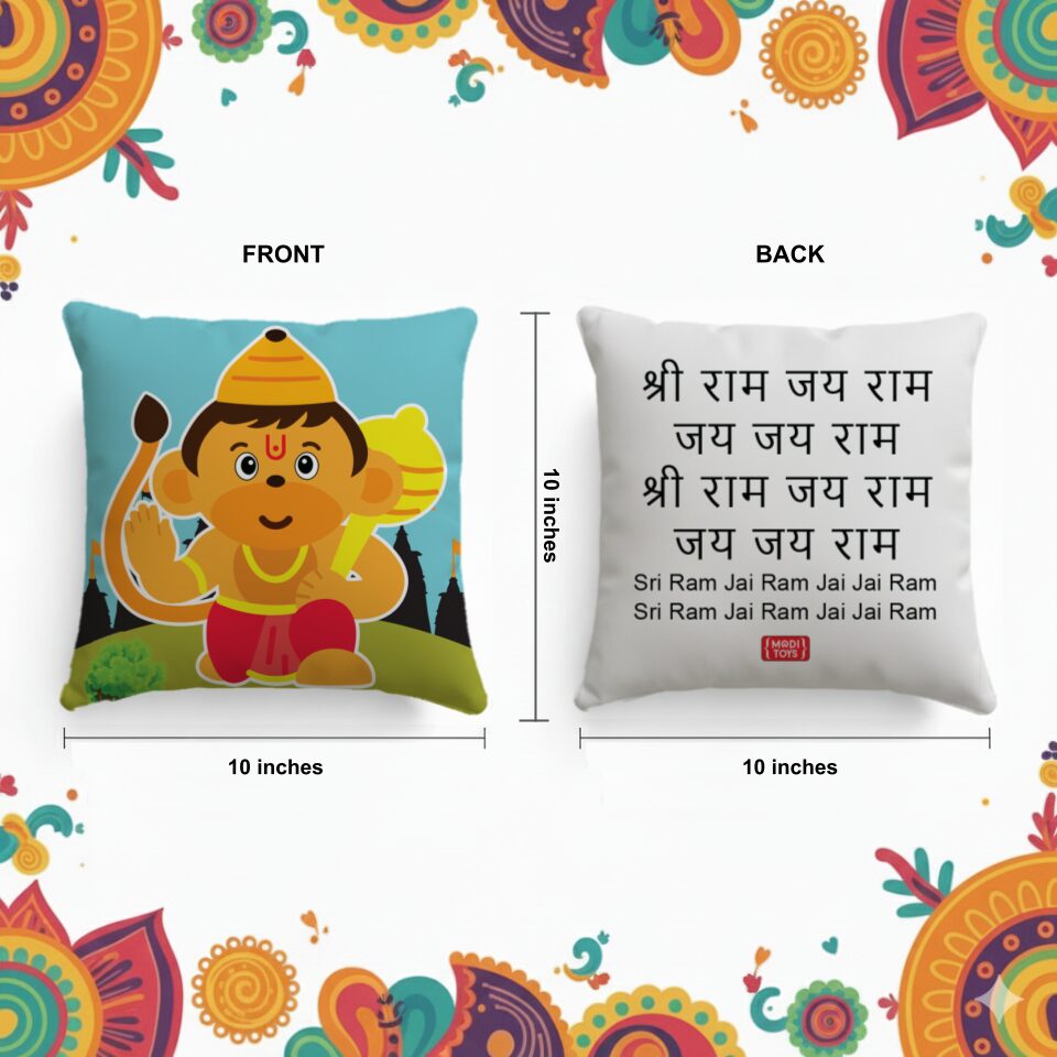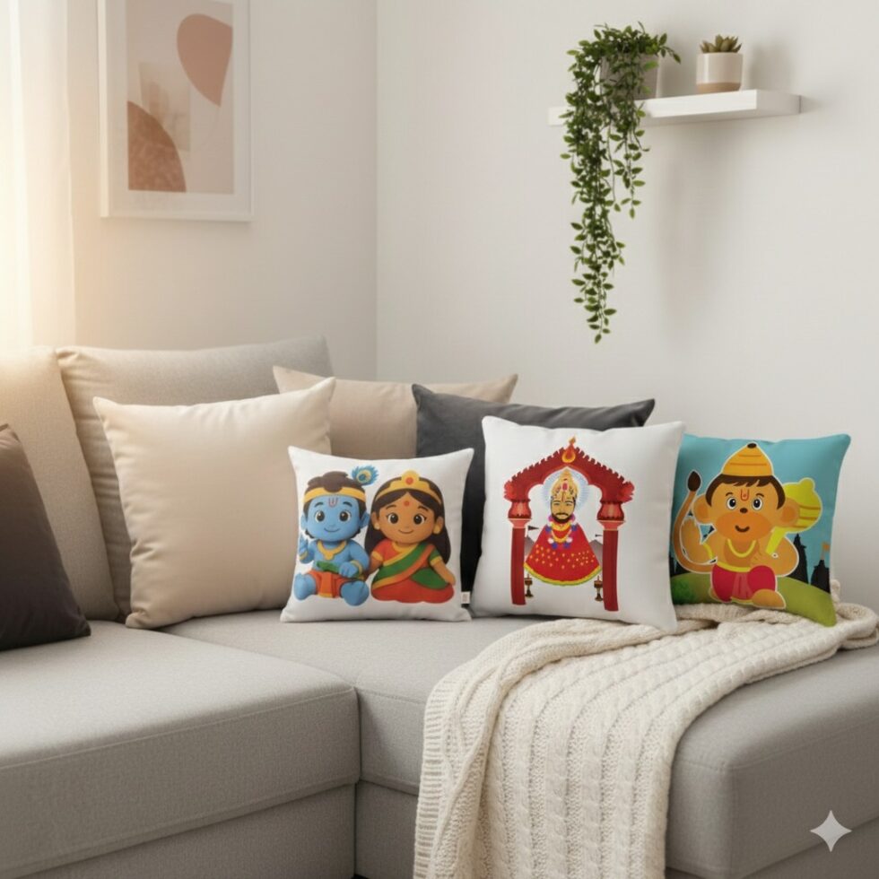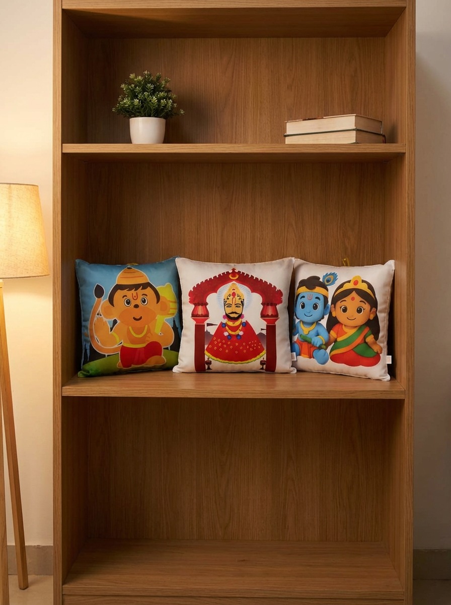 Elevate your décor with this set of three Hindu-themed hanging pillow plush cushions featuring Radha Krishna, Khatu Shyam, and Hanuman. Each 10×10 inch square cushion showcases vibrant, double-sided prints with sacred mantras and detailed artwork. Made from soft plush polyester with comfortable padding, they can be used as wall hangings or accent pillows. Perfect for adding a spiritual touch to living rooms, prayer spaces, or for festive gifting.