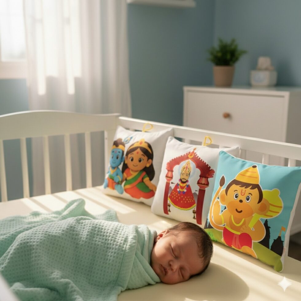 - DOUBLE-SIDED MANTRA PRINT: Each pillow showcases high-quality prints on both sides with vivid multicolour graphics and sacred mantras, ensuring visual appeal from every angle and adding spiritual depth to your décor