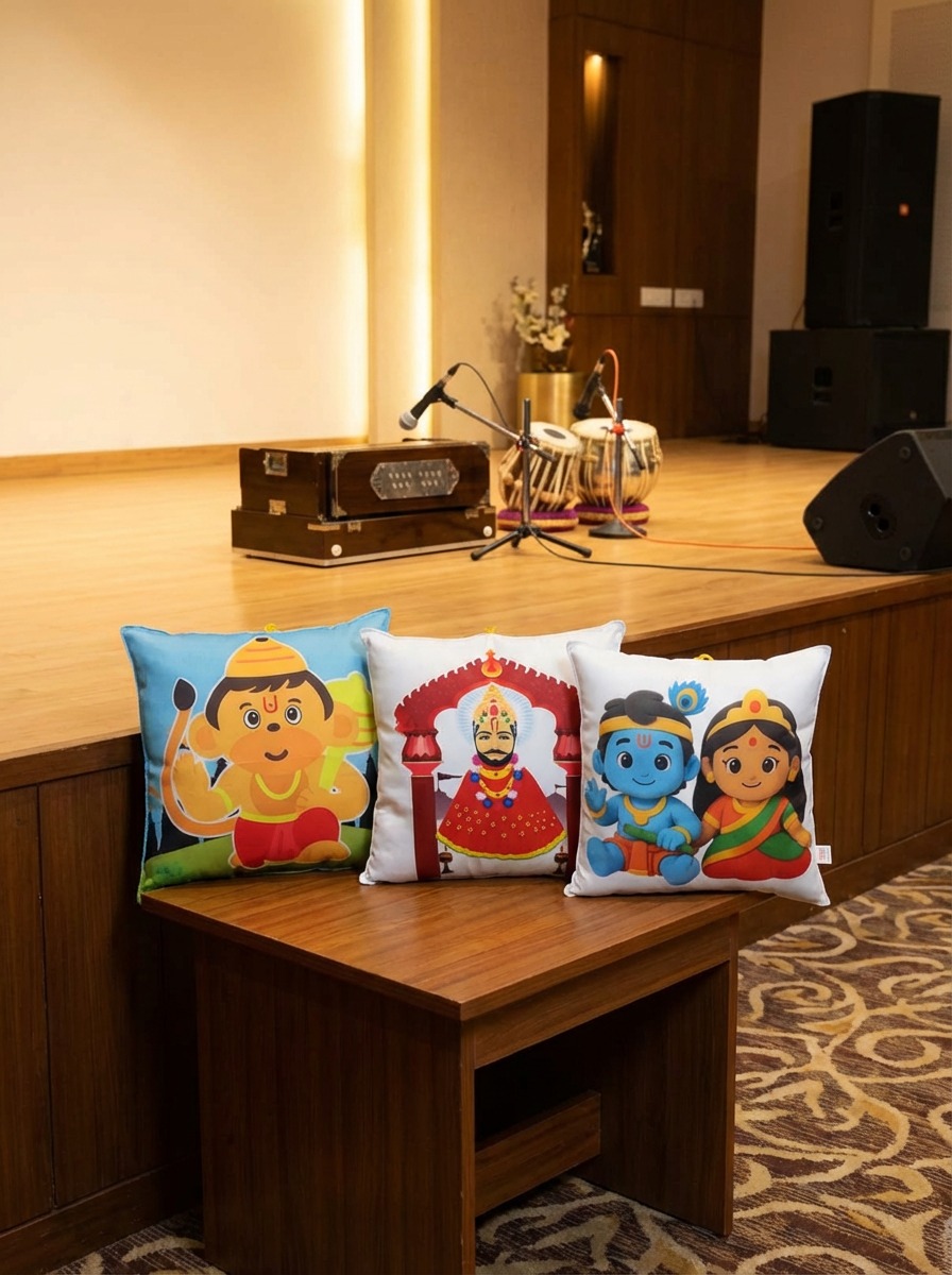 - RELIGIOUS THEME COMBO: Set of 3 decorative hanging pillow plush featuring beloved Hindu deities – Radha Krishna, Khatu Shyam, and Hanuman in vibrant, colourful designs that add spiritual charm to your home