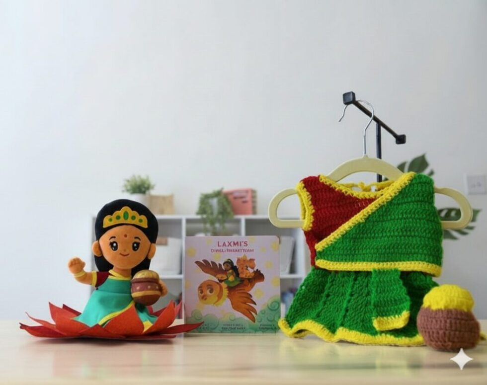 This is a complete devotional gift set featuring Goddess Laxmi Ji with a built-in mantra singing feature. The toy is designed for children and gifting purposes and helps introduce devotion and cultural learning in a simple way. The set includes a 7-inch Laxmi Ji mantra-singing soft doll, an illustrated Laxmi story book, and a handmade crochet dress with accessories.