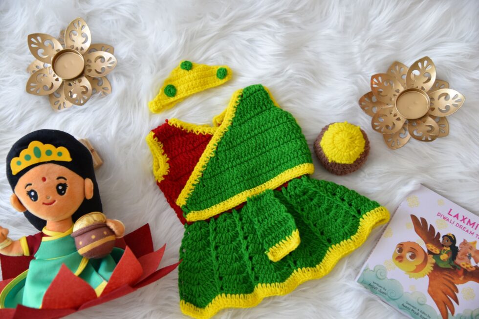 7-inch Laxmi Ji mantra singing soft toy gift set with press-activated mantra sound. Includes illustrated Laxmi story book and removable handmade crochet dress. Suitable for kids and devotional gifting on festivals and special occasions.